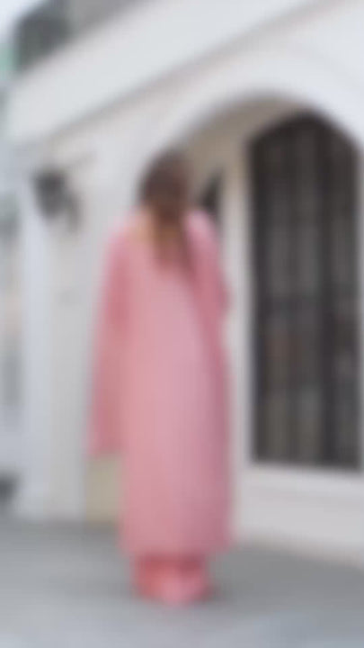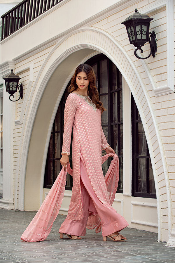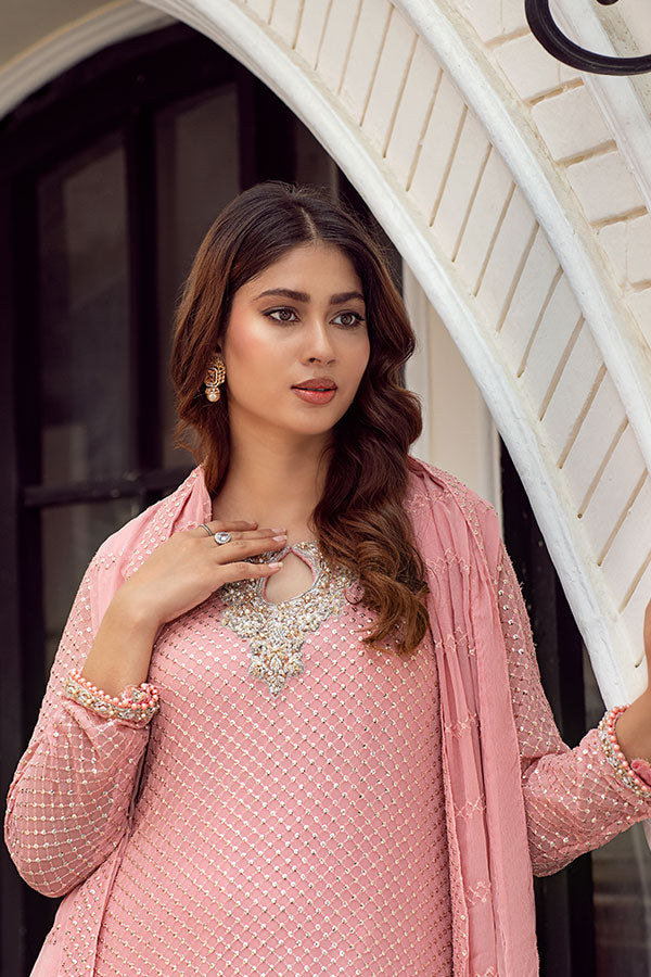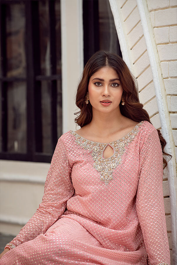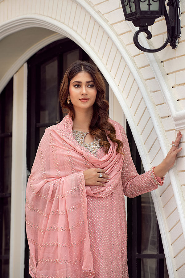 Radiating soft elegance, this baby pink ensemble is crafted from luxe faux chiffon, featuring a sequin-embroidered shirt and matching dupatta that shimmer gently with every movement. The subtle sparkle adds a graceful charm, perfect for both daytime celebrations and twilight affairs.