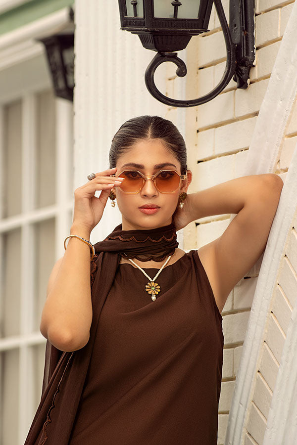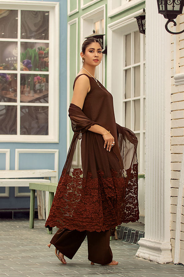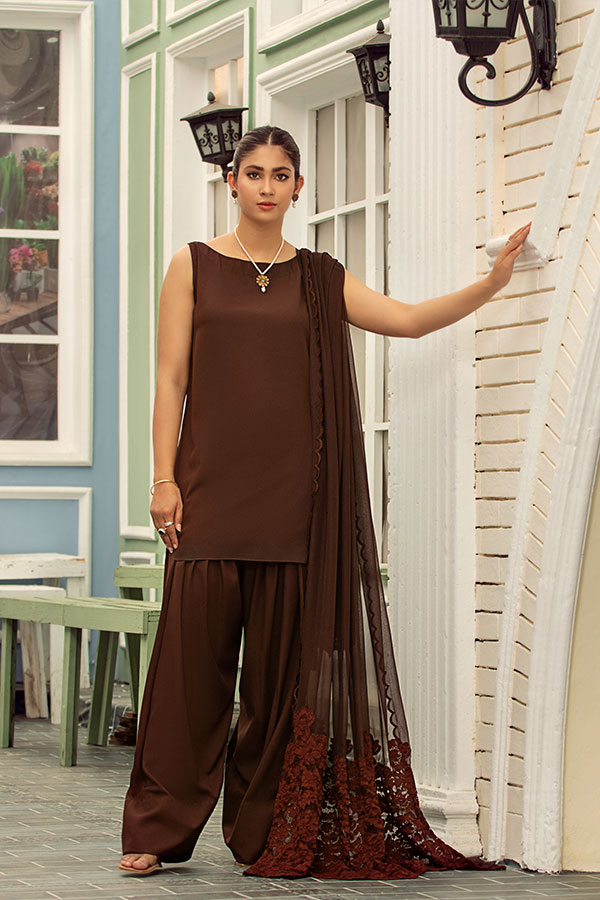 A striking ensemble in deep chocolate brown, this outfit redefines contemporary elegance. The sleeveless shirt, tailored in pure georgette chiffon, drapes effortlessly for a sleek, fluid silhouette. Paired with a voluminous farshi shalwar, the look balances tradition with bold modernity, making a statement of refined luxury.