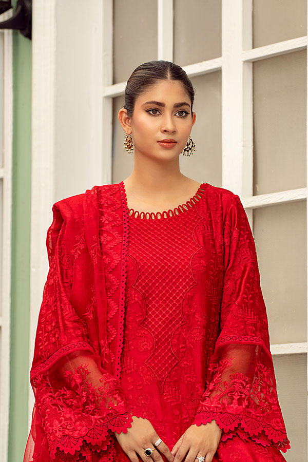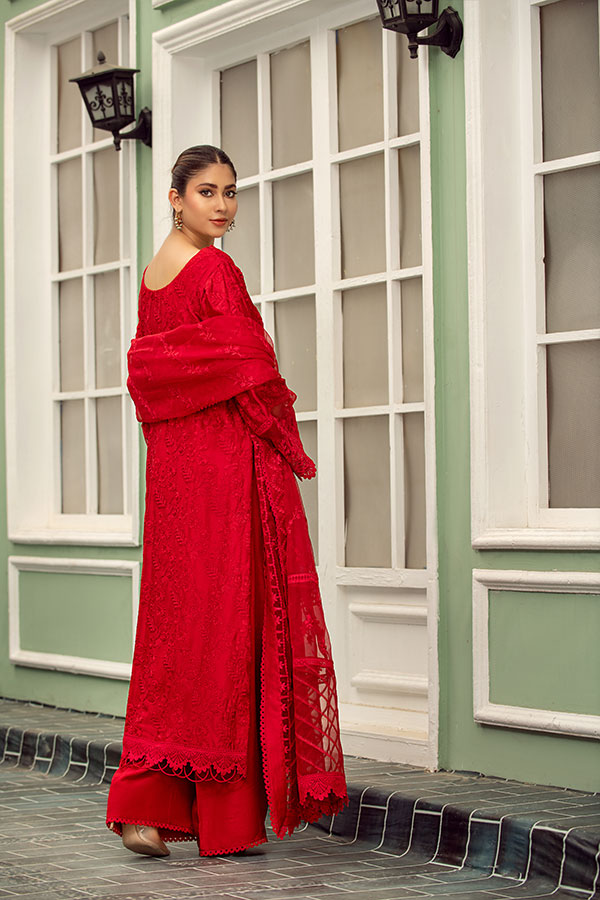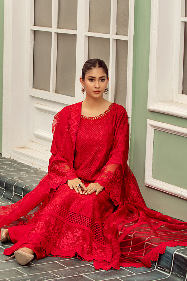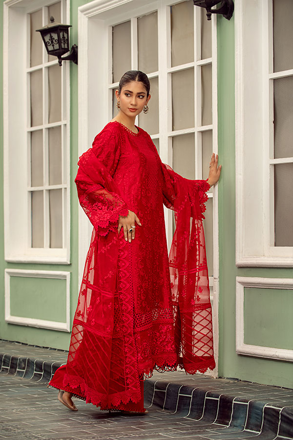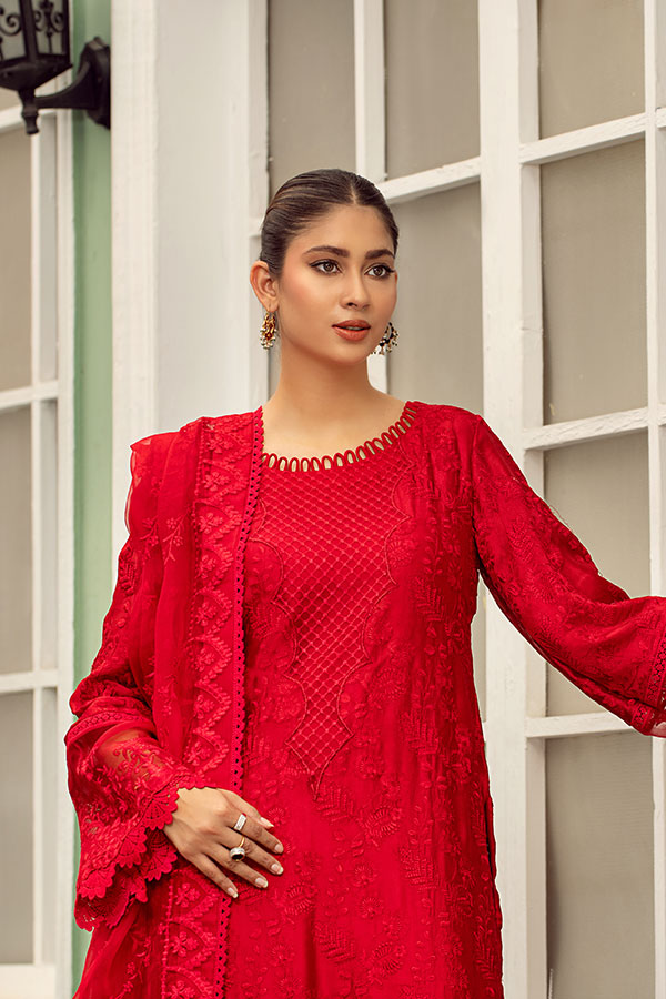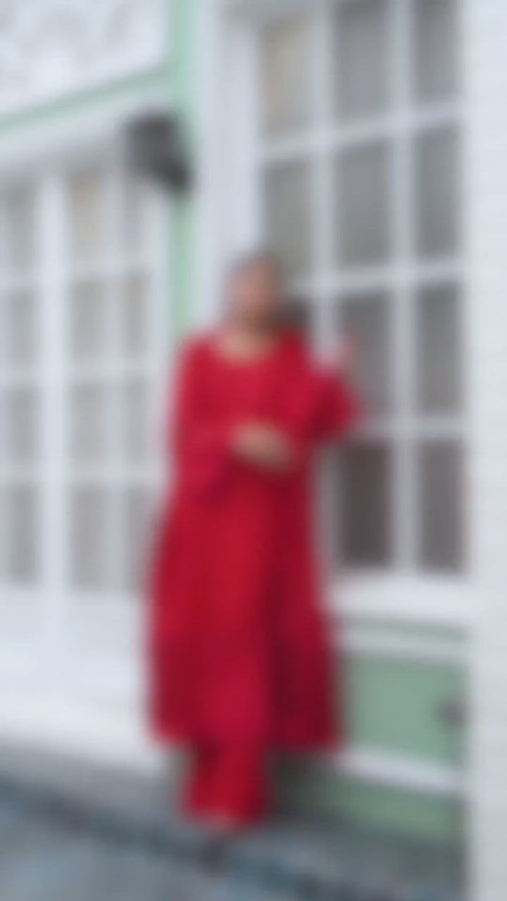 This stunning ensemble features a richly embroidered long kameez paired with wide-leg trousers and a matching dupatta, all in a vibrant crimson hue.
