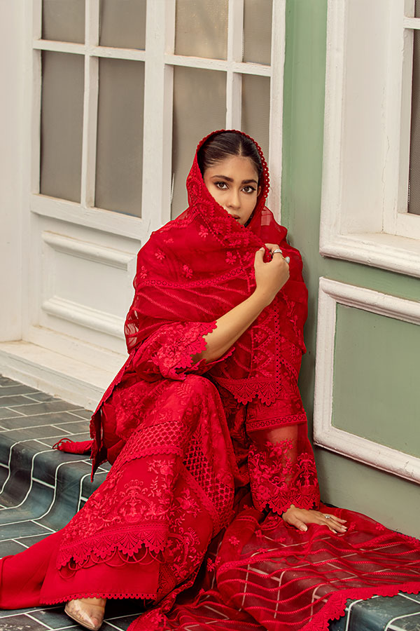 The outfit is adorned with intricate lacework, delicate cutwork, and floral embroidery—exuding timeless charm. The sheer organza dupatta adds an ethereal touch, while the scalloped hem and sleeves complete the look with finesse.