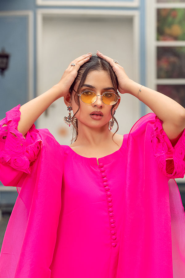 Bold and effortlessly chic, this fuchsia pink ensemble makes a striking statement in pure georgette chiffon. The shirt features modern cutwork on the sleeves, adding a playful yet polished edge, while delicate loop buttons along the front bring a touch of classic charm with a modern twist.