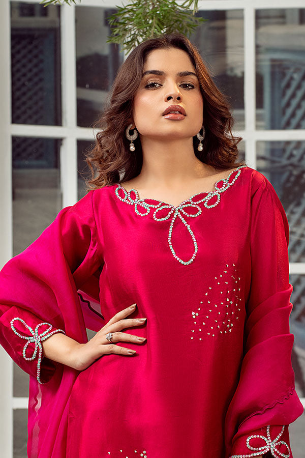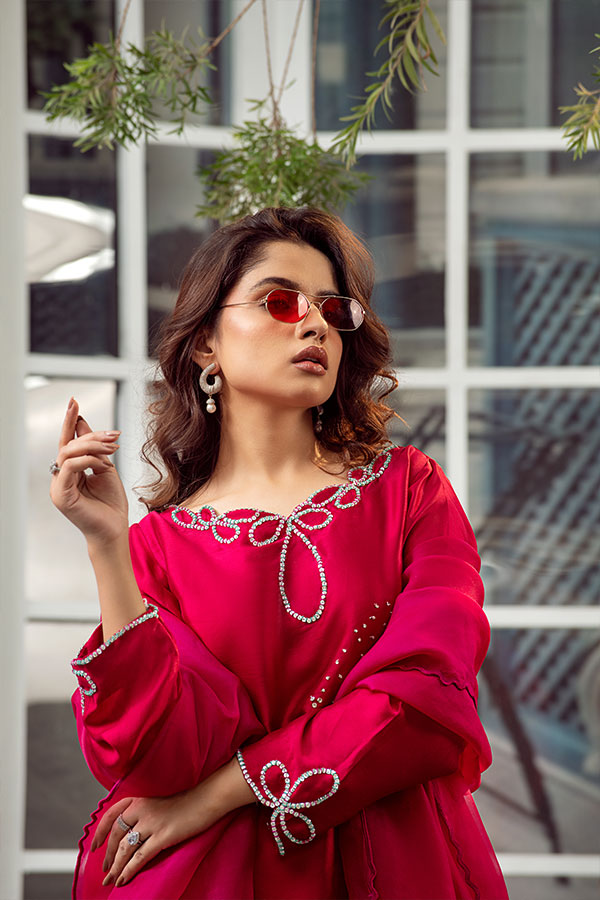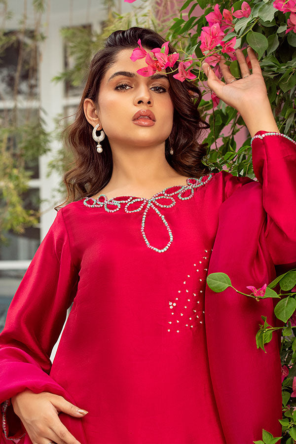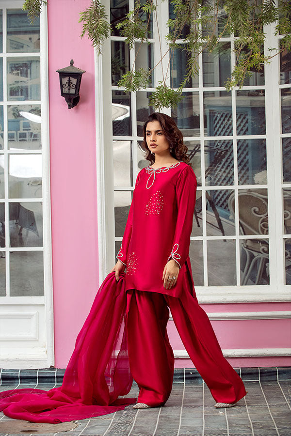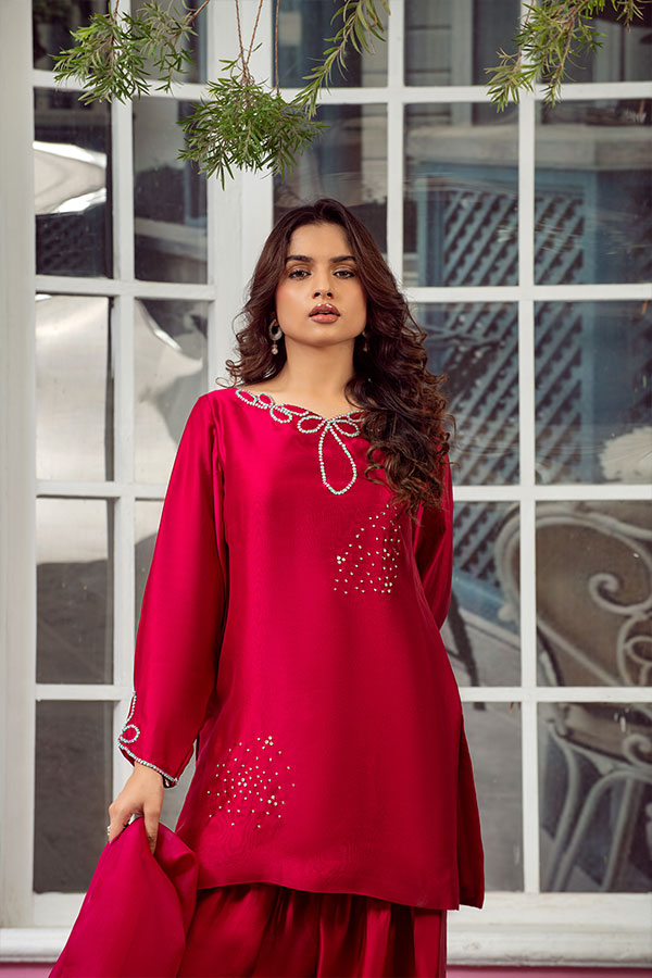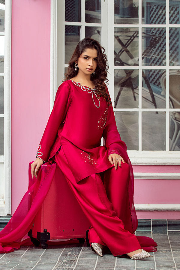 Bold and captivating, this radiant red ensemble is a statement of timeless elegance. The shirt and farshi shalwar are crafted from pure Tessel silk, offering a luxurious drape and regal finish.