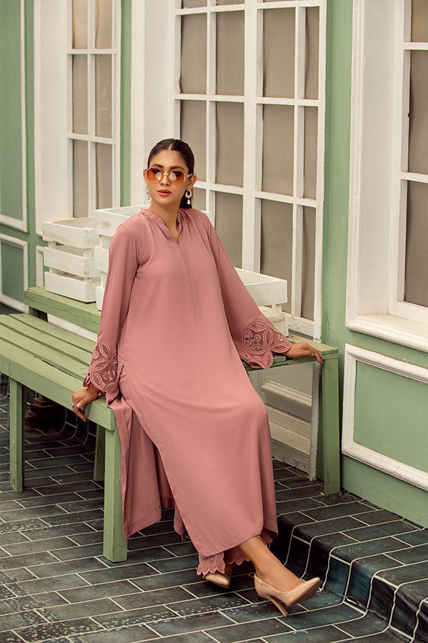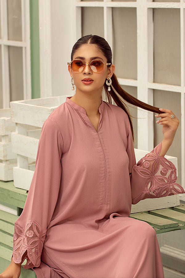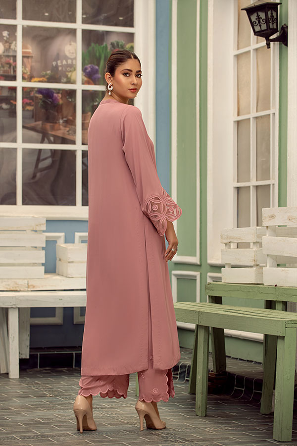 A chic and feminine statement in soft rose pink, this ensemble is crafted from pure georgette chiffon, designed to flow with effortless grace. The shirt features contemporary cutwork on the sleeves, adding a bold yet refined edge to its minimalist silhouette.