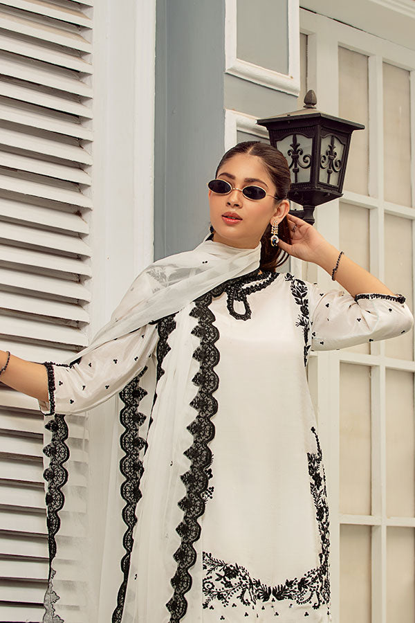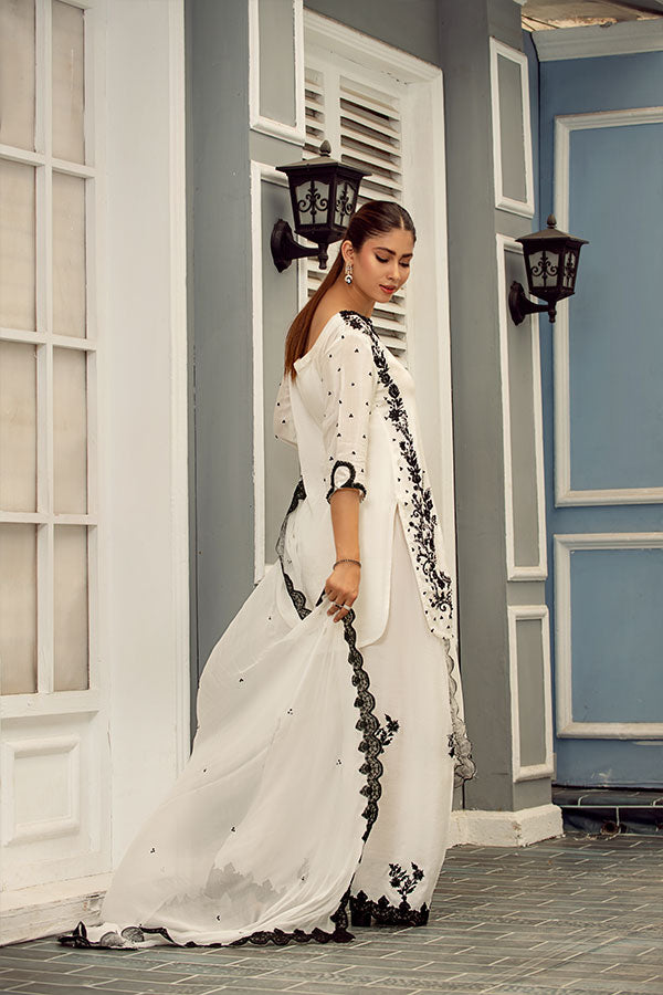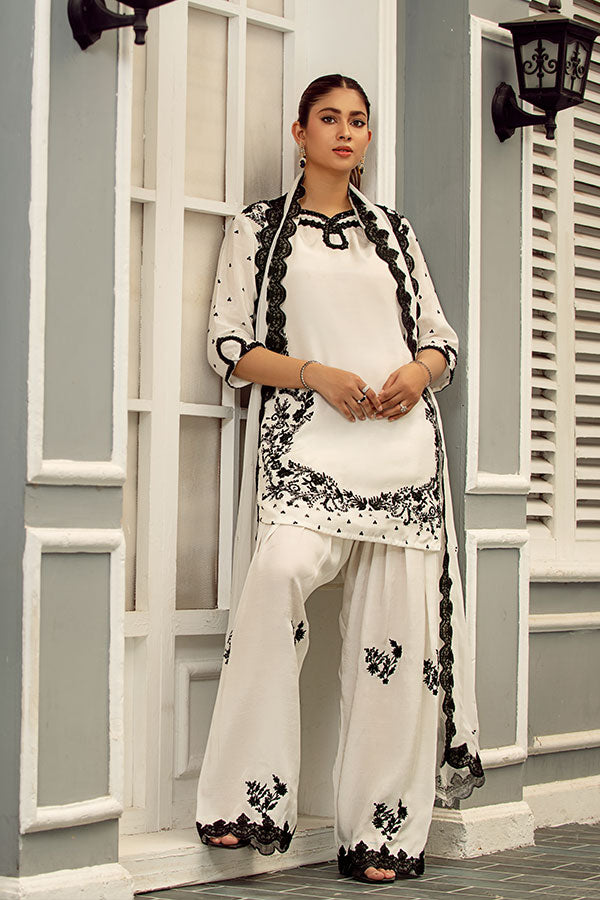 The raw silk shirt features classic black thread motifs, paired with a matching farshi shalwar adorned in floral embroidery. The coordinated dull chiffon dupatta is finished with bold scalloped edging for added flair.